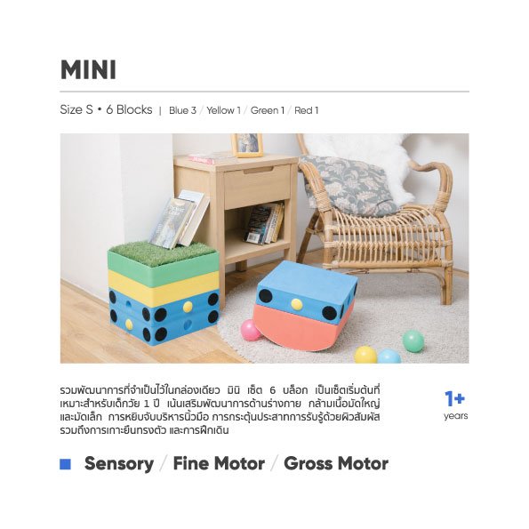 Take it anywhere for endless play and learning! Mini is the perfect starter set for young children (1Y+)*, designed to promote essential physical development, both fine and gross motor skills, hand-eye coordination, and sensory exploration with a variety of textures. It also supports standing, balancing, and early walking practice.